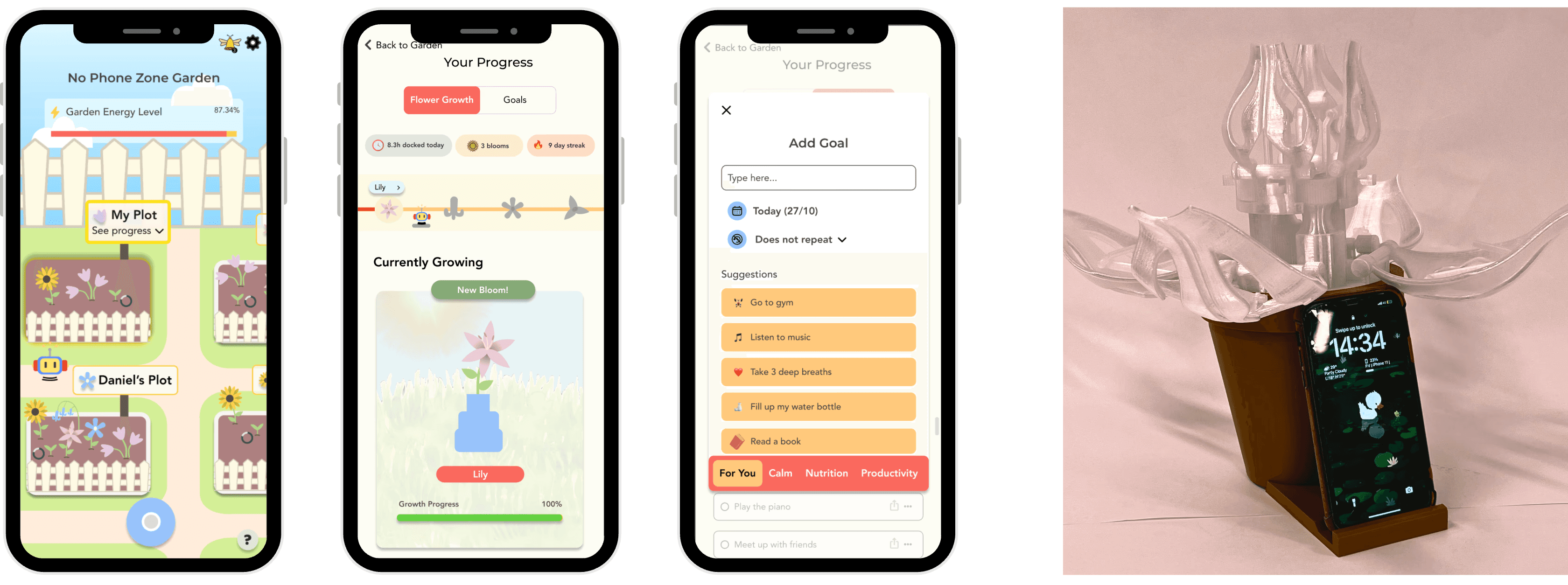 Users dock their phone during moments of potential distraction, initiating a period of disconnection. During this time, a flower grows within the app, gradually contributing to a larger garden. The physical dock provides ambient feedback, reinforcing progress through light.