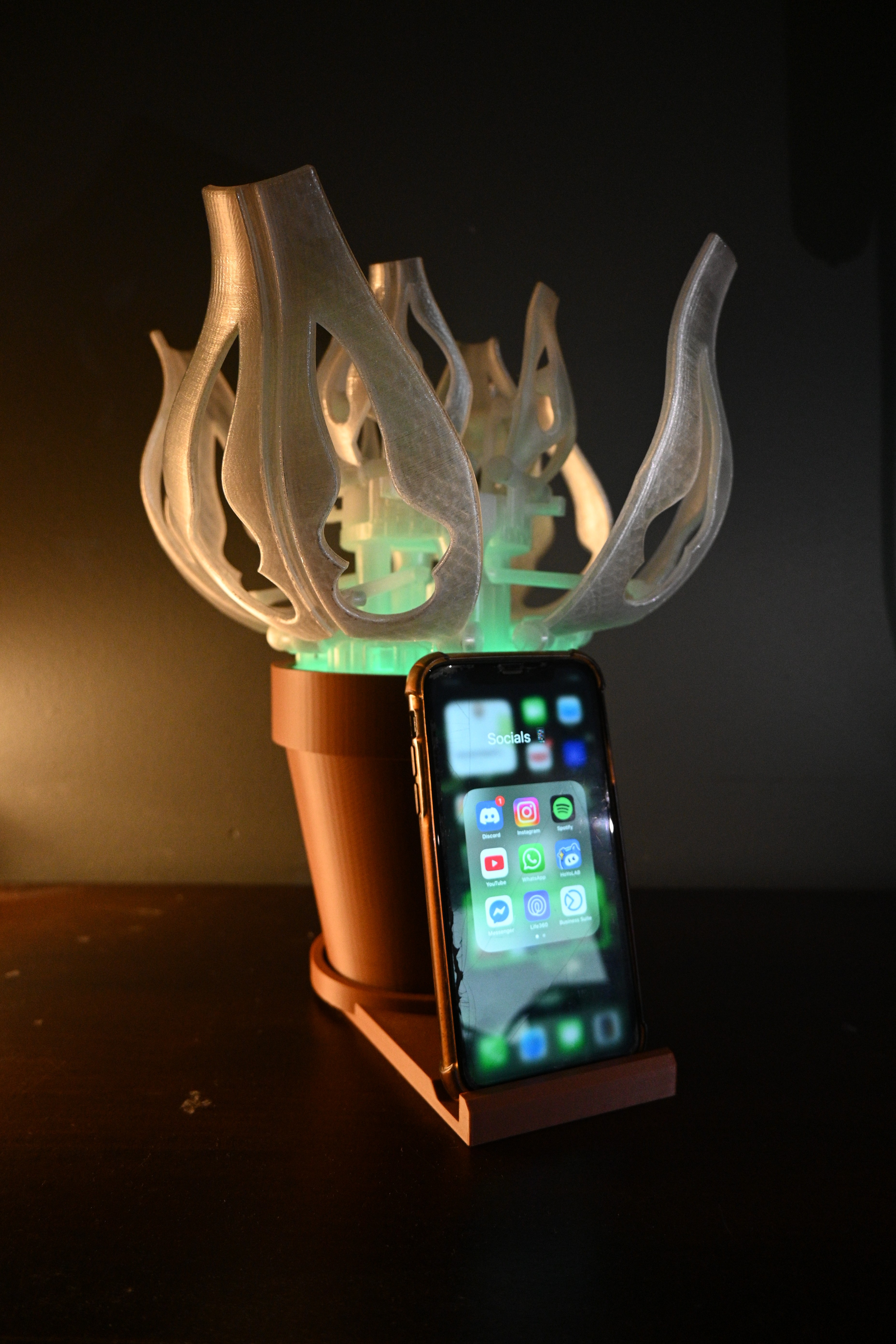 Replaced the mechanical flower with a light-illuminated version to improve feasibility. A custom pedestal was designed to house a puck light, enabling the flower to “bloom” through illumination.