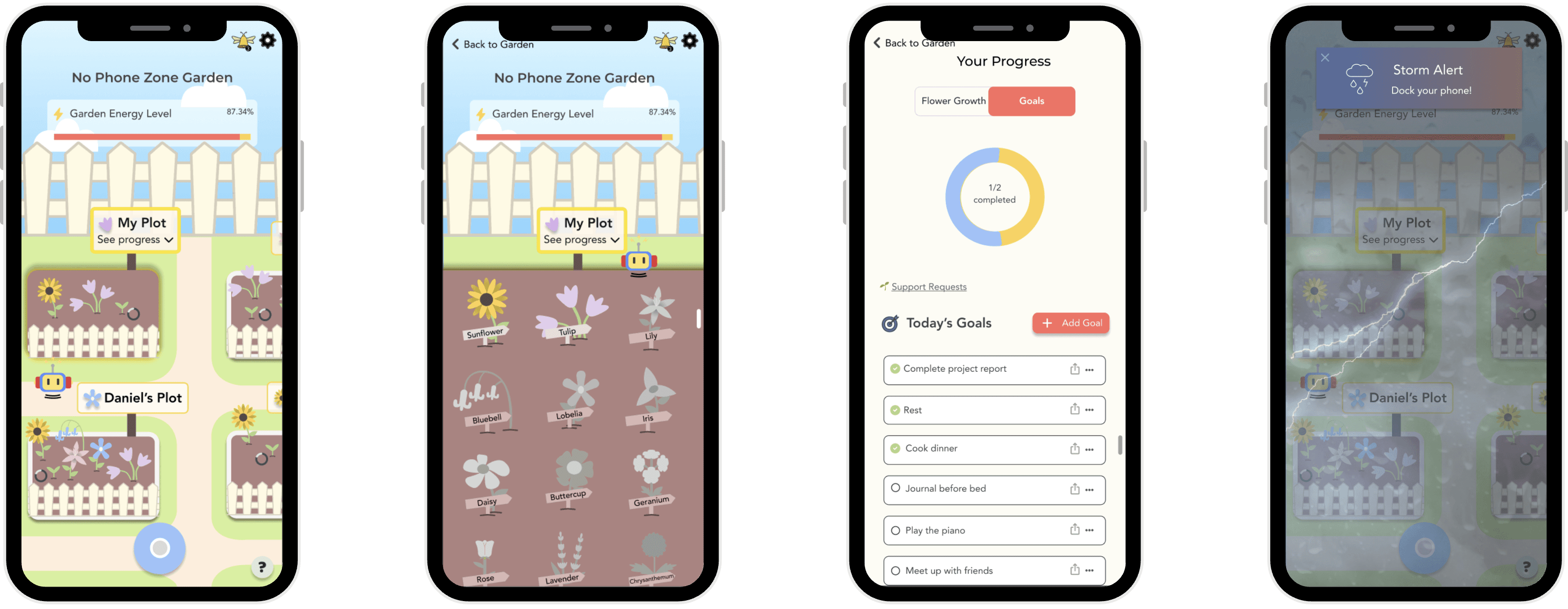 Left to right: community garden page, personal garden page, goals page, storm event