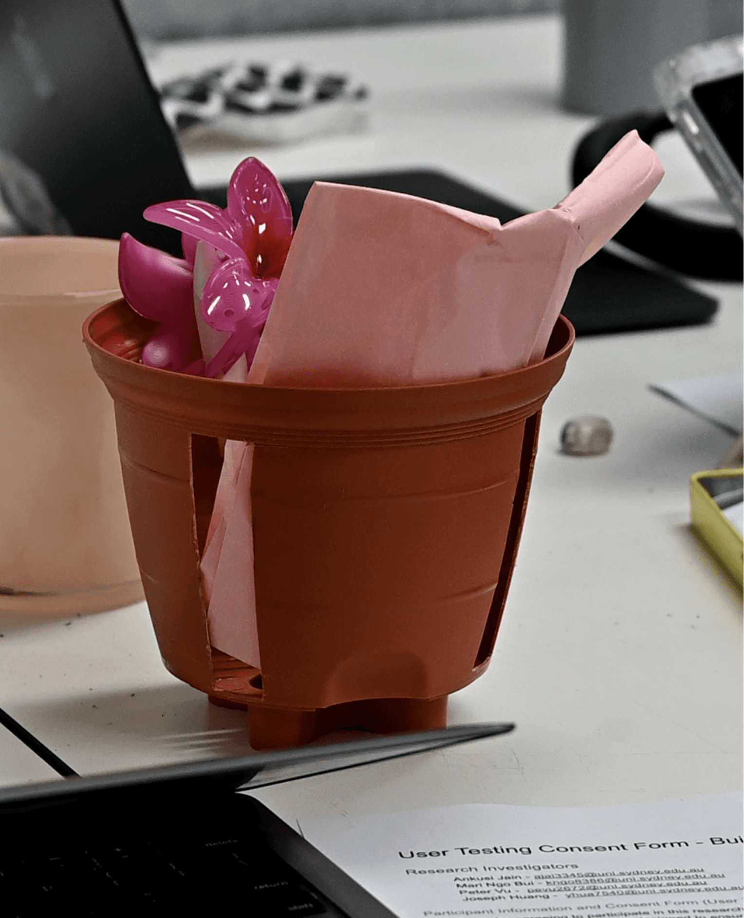 The initial idea was for the users to slide their phone into the pot, concealing their phone with the thought that if they can't see it then they won't be tempted. Testing was done through think-aloud followed by a system usability survey to evaluate usability and thoughts of the concept.