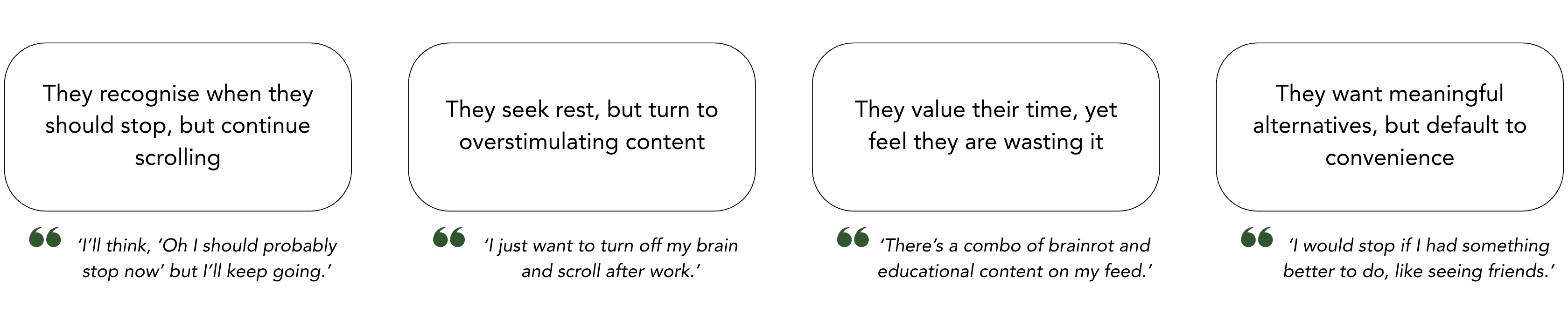 To better understand these behaviours, we gathered data through interviews, questionnaires, secondary research and online ethnographies, focusing on how young adults (18–25) engage with digital media during moments of boredom, stress, and mental fatigue.