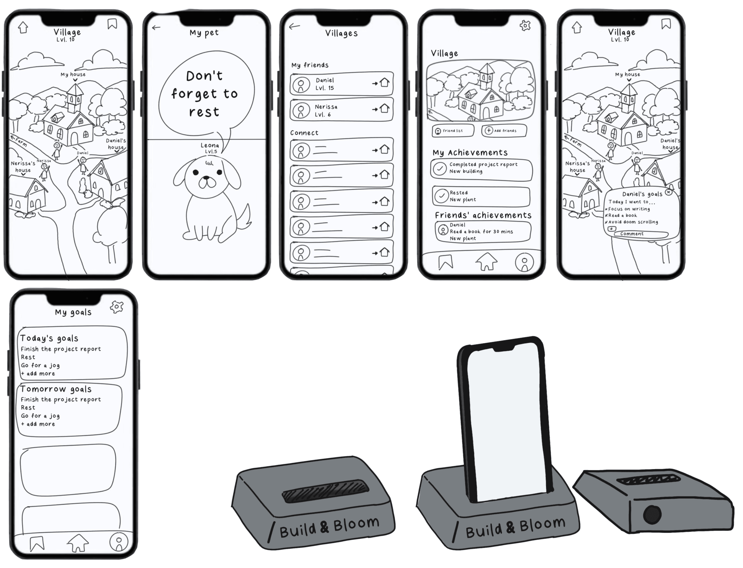 The final Build N Bloom system combines a physical docking station with a companion app to transform passive phone use into visible growth over time.
