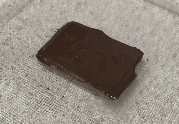 Chocolate melts were poured into the vacuum-formed mould to produce the first physical prototype. Once set, the bar released cleanly, weighing 52 g. While slightly thicker than ideal, the test highlighted how the mould could be refined for optimal form and usability.