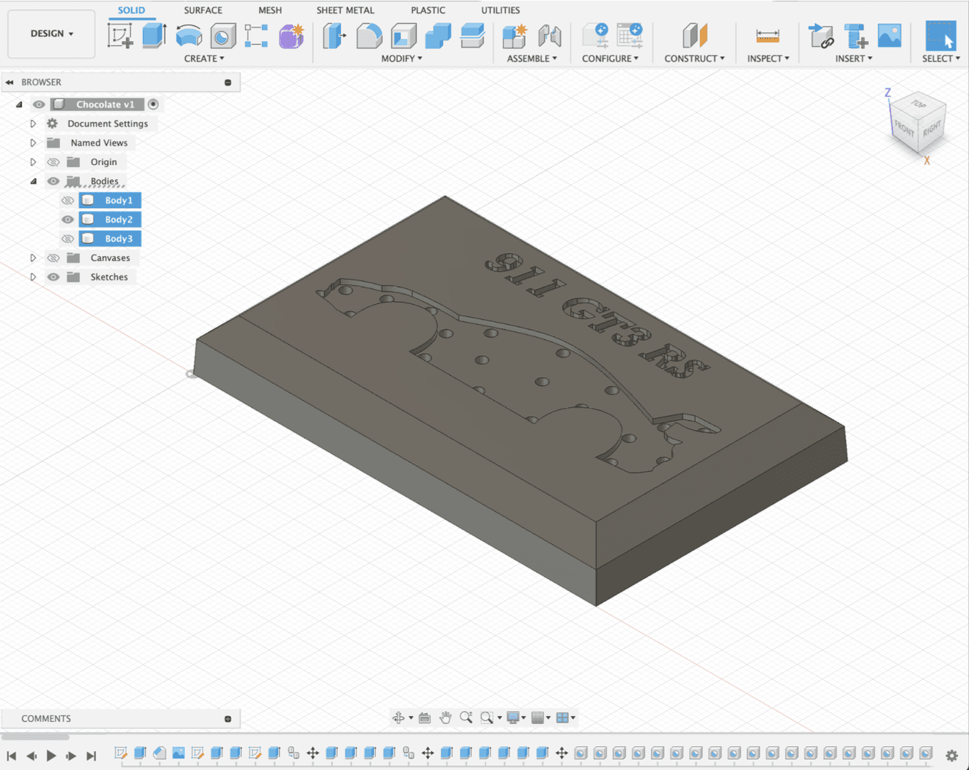 Using Fusion 360, the chocolate bar was designed as a clean, rectangular form. I included a subtle indentation of the Porsche 911 silhouette connects the product to the brand’s heritage while preserving a minimal, elegant aesthetic. Small air holes were added into the indentation to allow vacuum forming moulds to pull the plastic accurately during mould making.