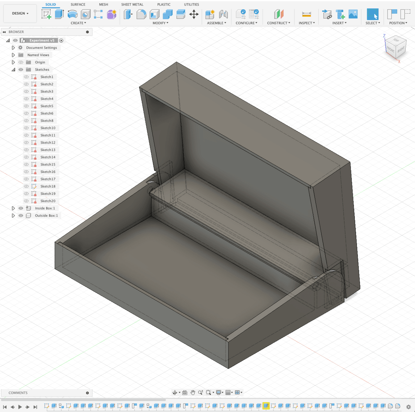 The packaging was modelled in Fusion 360, where individual components were sketched and assembled into a functional box prototype. Parametric dimensions and constraints ensured consistent spacing and accurate alignment of the finger joints and hinge mechanism. The lid sketch was exported to Adobe Illustrator to incorporate the final logo design.