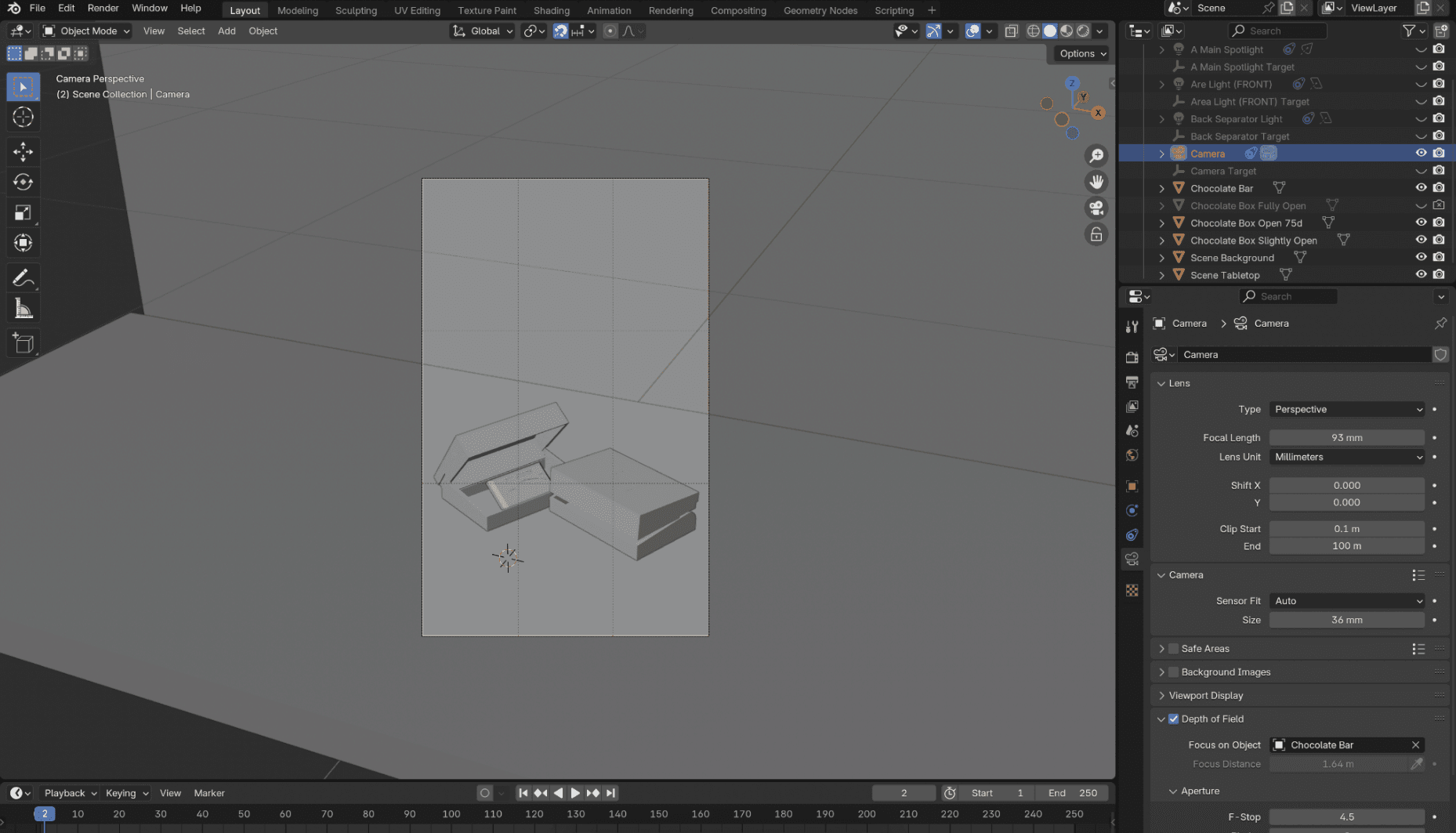 Before moving on to full chocolate and packaging models, I explored materials, textures, and lighting in Blender using simple geometric forms and fabric planes. I adapted online tutorials and procedural texture nodes to create materials that conveyed the premium, Porsche-inspired aesthetic. For rendering, I created a white box scene to allow the properties of the materials to stand out better.